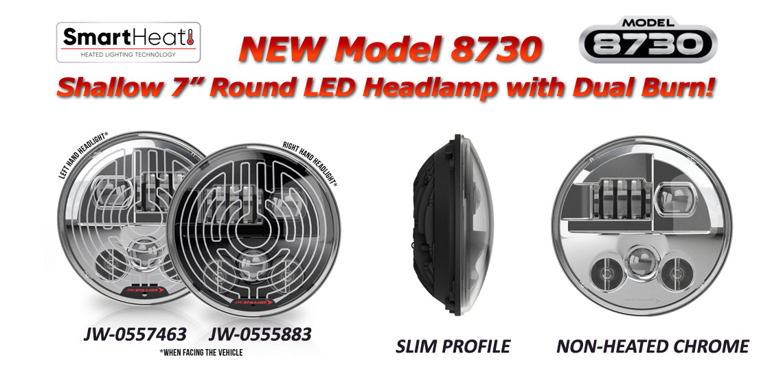 The new Model 8730 Shallow 7” series LED Headlights are designed to fit in vehicles that are tight on space and require a shorter depth than standard headlights. New advanced J3 optics are incorporated into this light, providing brighter output, dual burn technology and a superior beam pattern, for significantly less cost than the 8700 Evolution 2 headlamps. Sold as kit containing two lights: one left and one right headlamp. Available in heated and non-heated lens versions.