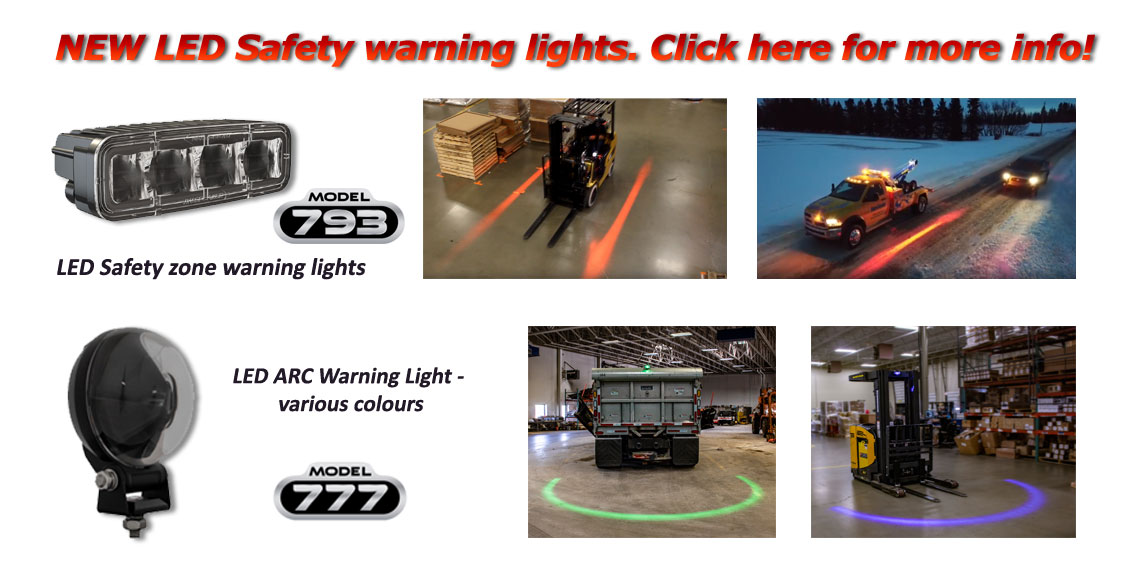 J.W. Speaker has upped the game on safety lighting once again with the new model 777 Arc Warning light & Model 793 Safety Zone warning light. Available in multiple colours, these high powered LED lights project bright linear lines or arcs around work equipment & forklifts.