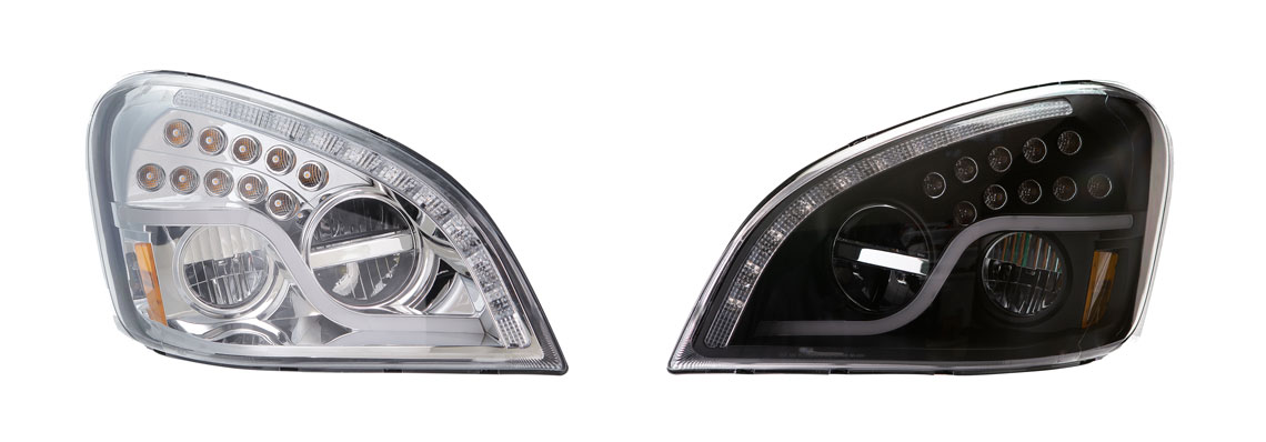 Shown above: STARR-LEDFLCS headlamp assembly for Freightliner Cascadia trucks. Superior plug & play replacement for the stock halogen headlamp assemblies found in 2007-2018 Freightliner Cascadias. These headlamps feature all LED low & high beam headlights, amber turn signal, side marker light and DRL white halo “eyebrow”. Available in chrome face or black face finish.