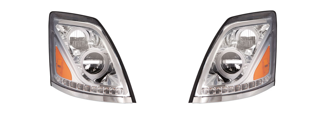 Shown above: STARR-LEDVNL headlamp assembly for Volvo trucks. Superior plug & play replacement for the stock halogen headlamp assemblies found in most 2004-2018 Volvo VNL, VNM as well as some VNR & VNX trucks. These headlamps feature all LED low & high beam headlights, amber turn signal, side marker light and DRL white halo “eyebrow”. Available in chrome face or black face finish.