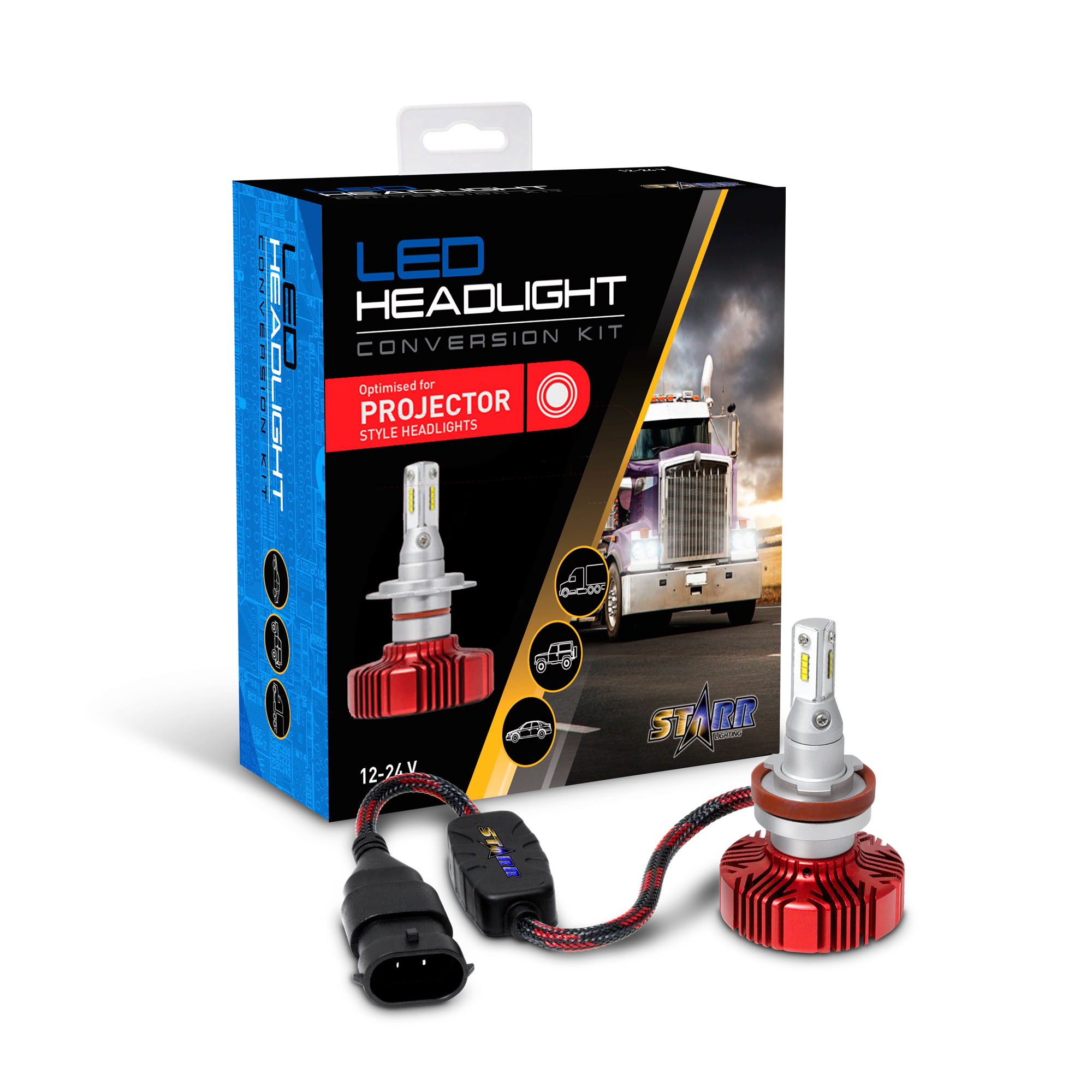 Checkout the brand new STARR “projector-optimized” Model 4000P bulb kits. The cutting edge V-shape LED chip configuration works specifically with the projector’s headlamp lens to produce the smoothest and most powerful beam pattern seen from an LED bulb. Now Available in H7 & H11 bulb base types.